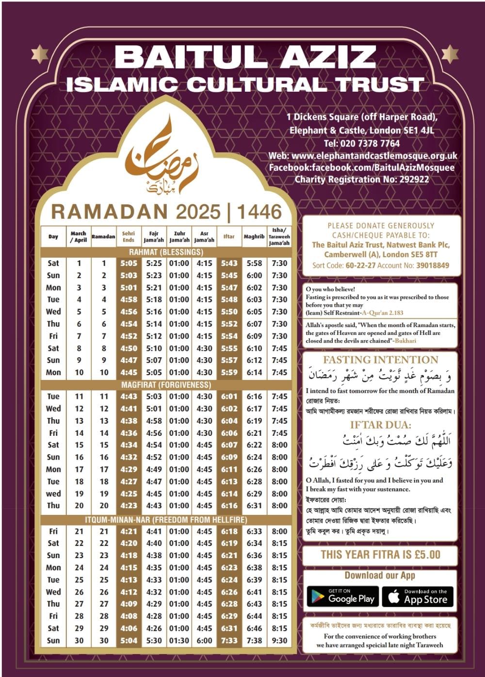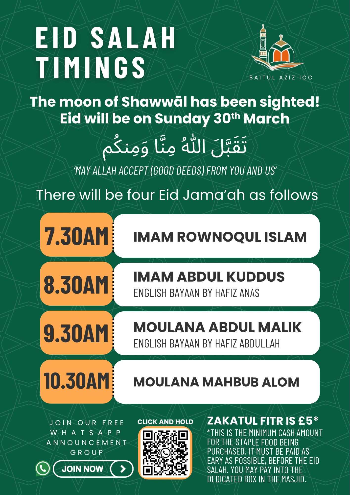 Baitul Aziz Masjid & Islamic Cultural Centre Eid Fitir 1446H Sunday 30th March 2025 Please pay your Zakkat Al Fitr BEFORE you pray your EID Jammat 1st Eid Jammat 7:30am…