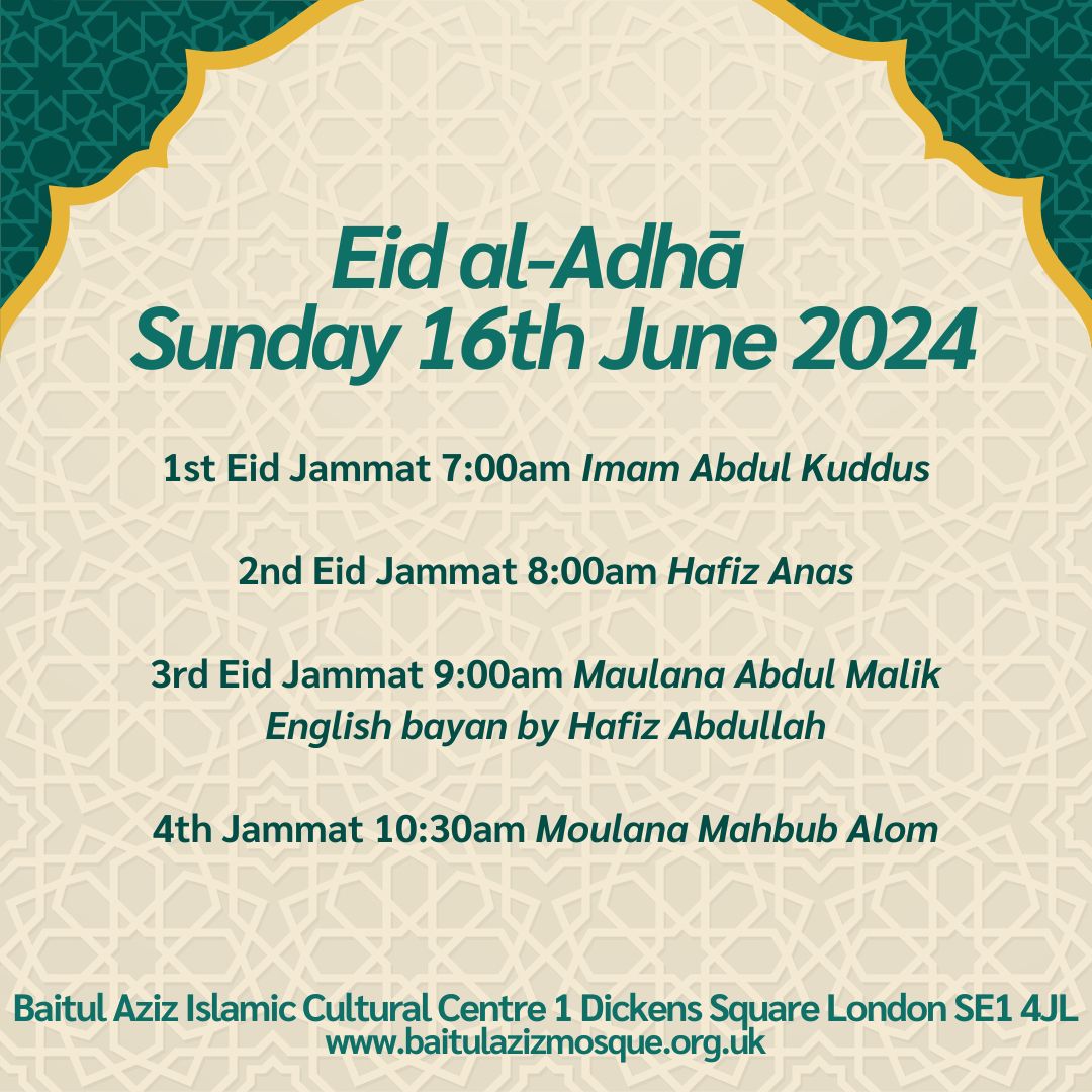 Baitul Aziz Trust (BAICC) THE DAY OF ‘ARAFĀT WILL BE ON FRIDAY 8 JULY 2022. Eid UL ADHAR Saturday 9th July 2022 1st Eid Jammat 7:00am By Imaam Abdul Kuddus…