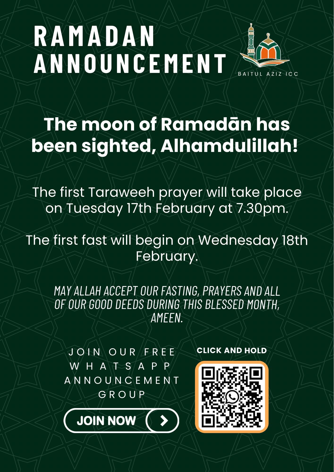 We are please to announce the launch of our free mobile application available on Android and IOS For update prayer time announcement and news Download our mobile application